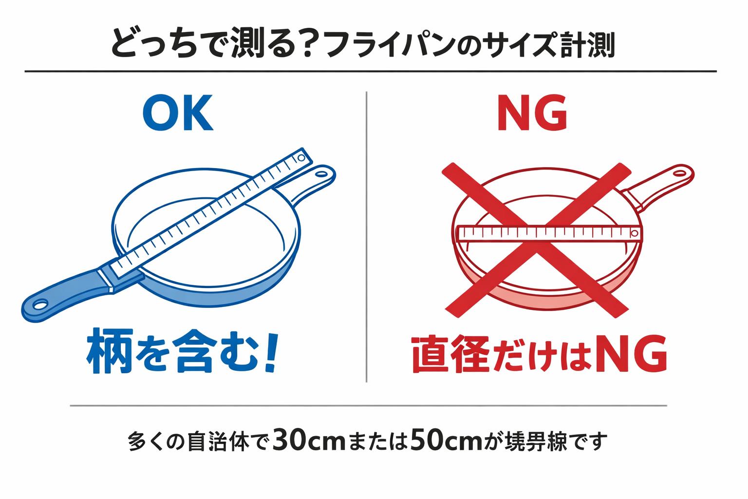 つまり、直径26cmのフライパンであっても、柄を含めた長さが45cmあれば、30cmルールの自治体では「粗大ごみ」になってしまうのです。「鍋の部分だけなら入るからOK」というわけではないので注意が必要です。