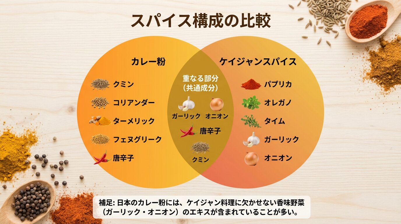ケイジャンスパイスとカレー粉の関係性を整理すると、その共通点が見えてきます。
