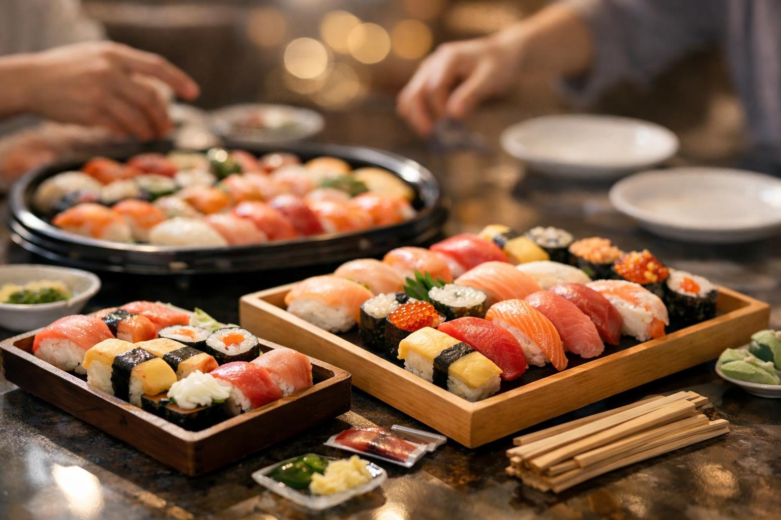 一方で、軽めに楽しみたいときやお酒と一緒に味わいたいときは、軍艦や細巻きが多めのセットを選ぶと、ひと口サイズで食べやすく、飽きずにいろいろな味を試せます。