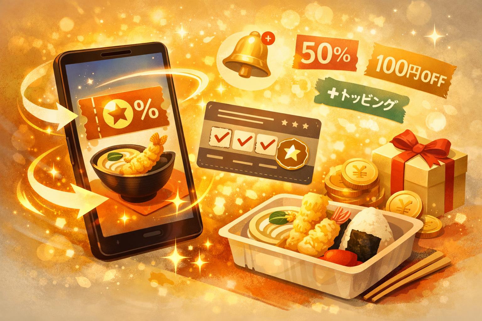 丸亀製麺をテイクアウトでよく利用するなら、まずは公式アプリの会員登録を済ませておくとお得です。公式アプリでは、テイクアウトでも使えるクーポンやスタンプカード、来店回数に応じた特典が配信されることがあり、「今日はテイクアウトにしようかな」と思ったタイミングでアプリ内のクーポン画面をチェックするだけで割引やトッピングサービスが受けられる場合があります。