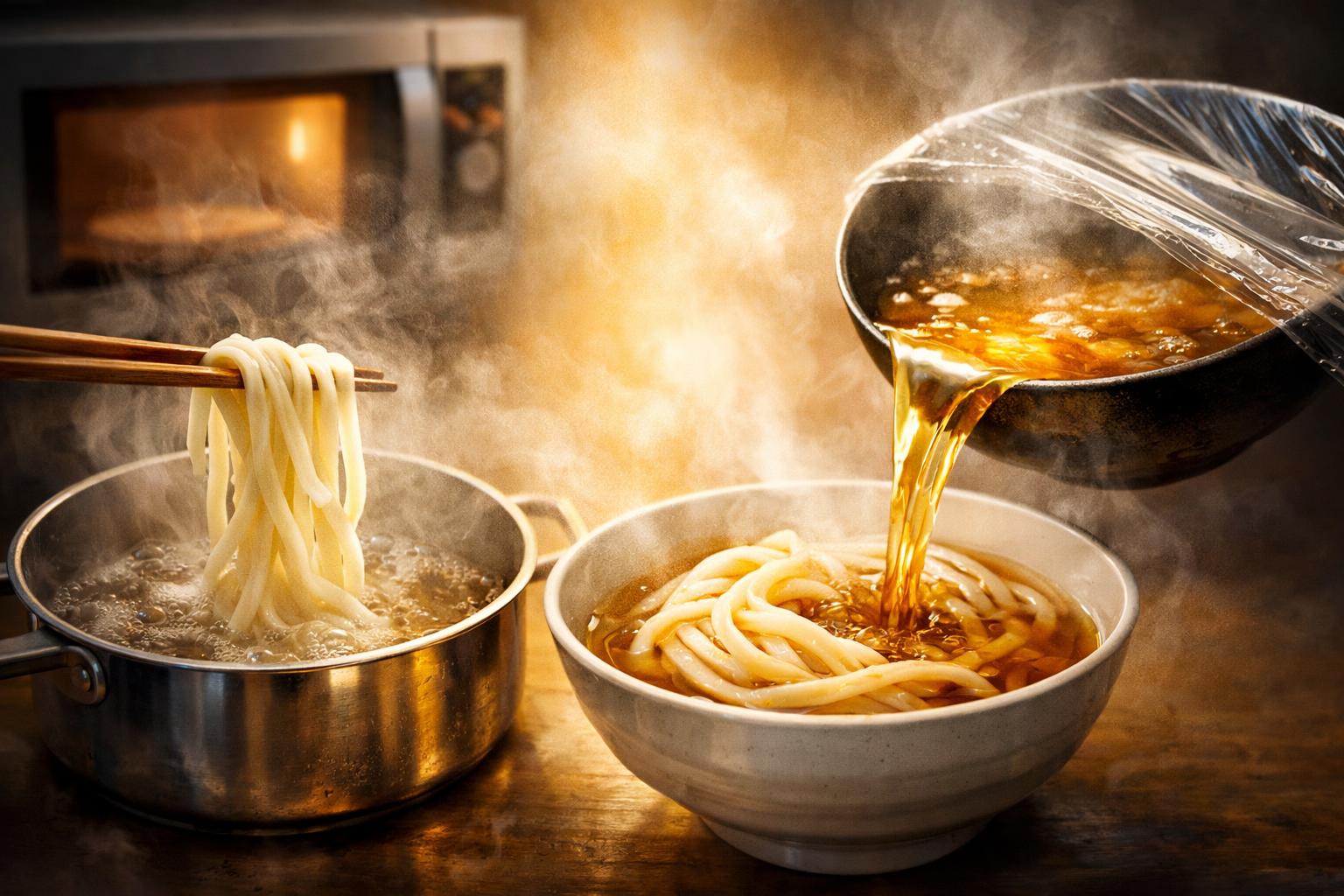 電子レンジで温めるときは、まず麺のフタを少しだけずらして蒸気の逃げ道を作り、様子を見ながら短い時間ずつ追加加熱します。加熱ムラが気になるときは、一度取り出して軽くほぐしてから再び温めると、全体がふっくら仕上がります。だしは吹きこぼれやすいので、必ずレンジ対応の器に移し替え、ラップをふんわりかけて弱めの出力で温めるのが安心です。