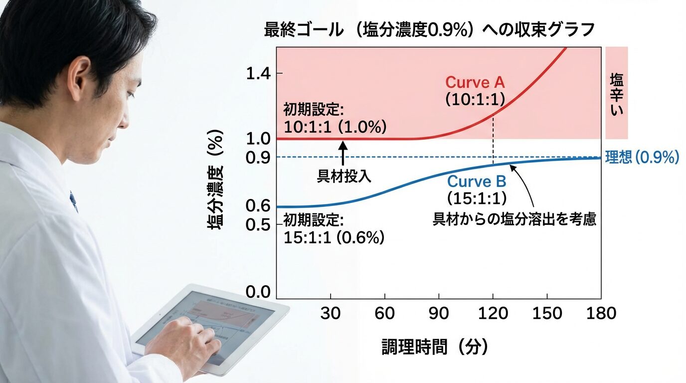 この「15:1:1」という比率は、最終的な塩分濃度を0.8〜0.9%(和食の吸い物よりやや濃い程度)に収束させるための逆算から導き出されたアルゴリズムです。