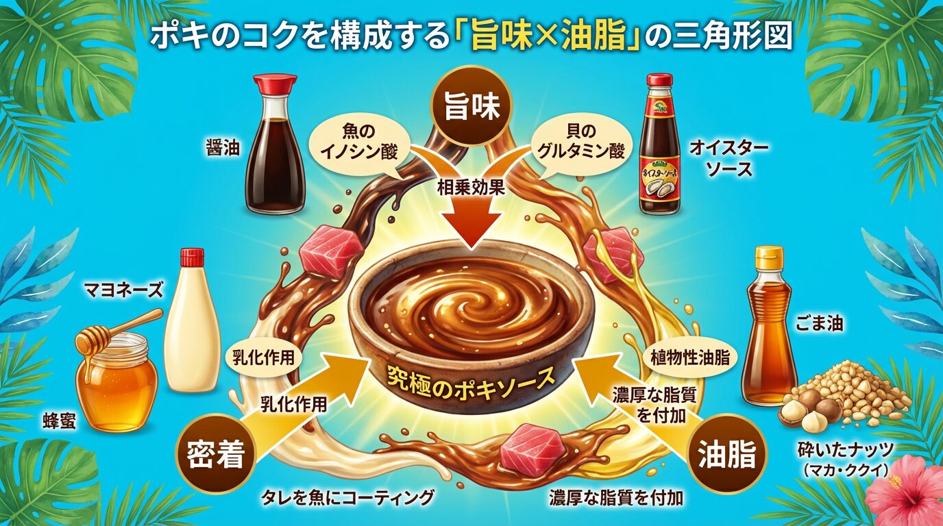 結論から申し上げましょう。専門店のポキ丼にある「重厚なコク」の正体は、動物性の旨味と濃厚な油脂感、そしてタレを魚に密着させる『乳化作用』の掛け算です。