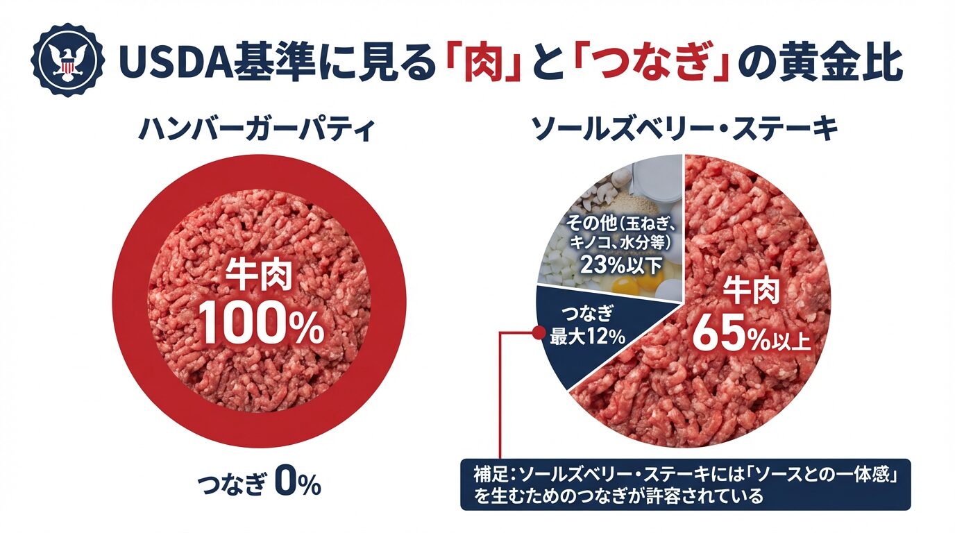 私がニューヨークの厨房にいた頃、最も頻繁に受けた質問の一つが「なぜこのメニューをハンバーガーとは呼ばないのか?」というものでした。その答えは、米国農務省が定める「肉とつなぎの比率」にあります。ハンバーグが自由な発想で作られる「家庭料理」であるのに対し、ソールズベリー・ステーキは公的に管理された「規格料理」としての側面を持っているのです。