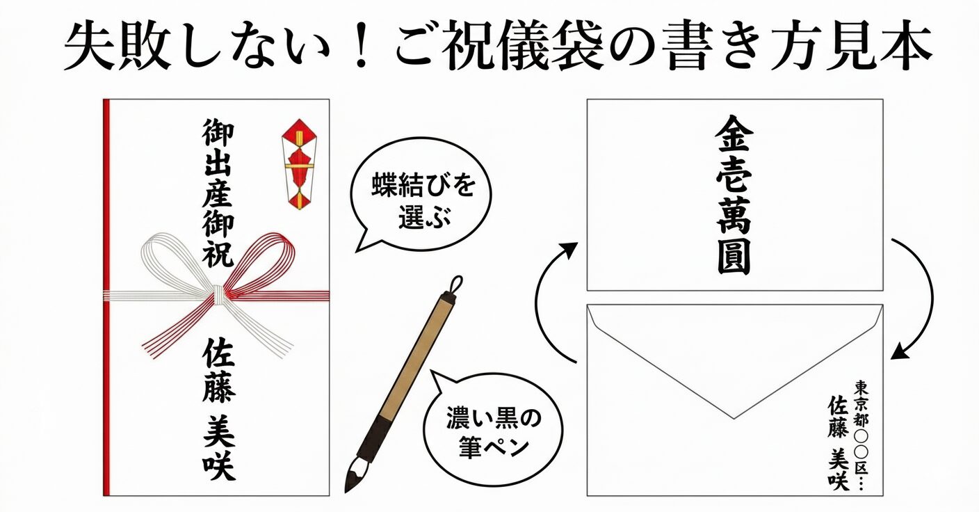 最後に、ご祝儀袋の書き方をおさらいしましょう。「あれ、名前ってどこだっけ?」「金額は漢数字?」という疑問を、図解で解決します。