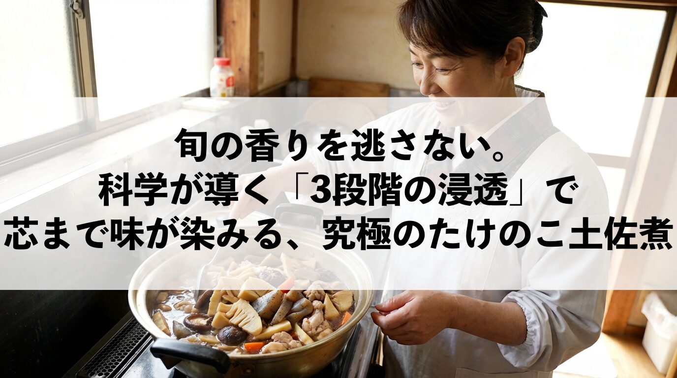 この記事では、調理科学の視点から導き出した「3段階浸透メソッド(80℃維持・粗熱放置・から煎り鰹節)」の全貌を公開します。この科学的アプローチを習得すれば、あなたの作るたけのこの土佐煮は、一口噛むごとに溢れる出汁の旨味で家族を驚かせる「一生モノの逸品」に変わります。